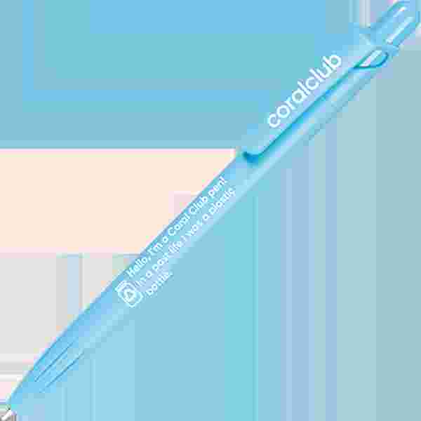 Przyciskany długopis wykonany z materiału PET-RECYCLED z nadrukiem "Hello, I'm a Coral Club pen! In a past life I was a plastic can".